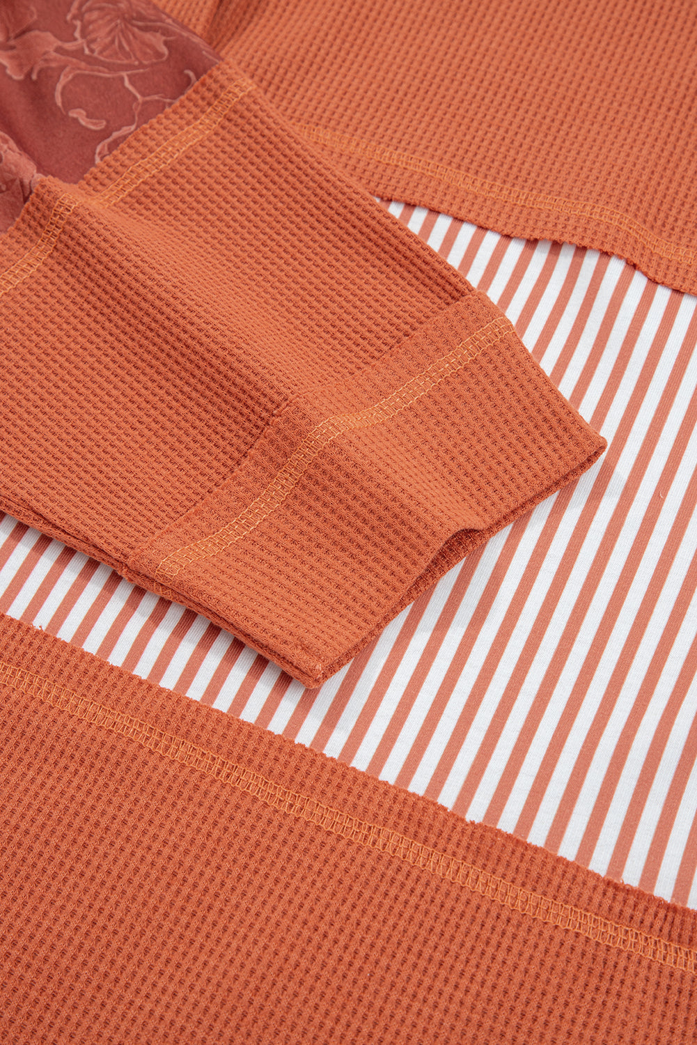 Cinnamon Waffle Printed Patchwork Drawstring Hooded Long Sleeve Top
